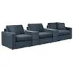 Includes 5 modular pieces: left-arm facing corner chair, armless chair, 2 consoles with storage and right-arm facing corner chair "Left-arm" and "right-arm" describe the position of the arm when you face the piece Modular pieces can float anywhere; sides are finished (with no connectors) Corner-blocked frame Loose reversible seat and back cushions; high-quality foam cushions wrapped in poly fiber Throw pillows included; soft polyfill Polyester upholstery Next-Gen Nuvella™ is a family-friendly fabric that is soft, easy to clean, stain-resistant and durable; easy-to-remove zippered covers for machine washing Clean fabric with mild soap and water, let air dry; for stubborn stains, use a solution of 4 oz. bleach to 28 oz. water Non-skid legs Console with removable plexiglass top; pull-out drawer for storage Platform foundation system resists sagging 3x better than spring system after 20,000 testing cycles by providing more even support Smooth platform foundation maintains tight, wrinkle-free look without dips or sags that can occur over time with sinuous spring foundations