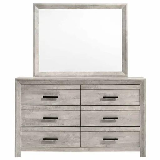 This dresser and mirror set is part of the Ellen White collection. It features a clean, modern design with ample storage space. The mirror is designed to perfectly complement the dresser, creating a cohesive look for your bedroom.