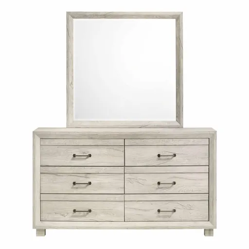 The Fort Worth 6-Drawer Dresser & Mirror set features angled, solid wood framing, giving it a unique and rustic look. The grove detail on the drawer fronts and industrial metal pulls add elegance to the overall design. Crafted with 3D wood grain PU paper veneer, this dresser has a realistic wood texture that adds depth to its crisp, white finish. Its unique, block feet provide fashionable stability and durability while the felt-lined top drawers ensures that your delicate items are well protected. Whether you're looking for extra storage or adding character to your bedroom, the Fort Worth 6-Drawer Dresser & Mirror is the perfect choice.