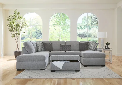 This 2-piece sectional is upholstered in a soft, durable fabric and features a modern design that will complement any living room. The chaise provides extra seating and lounging space, making it perfect for families or entertaining guests. The sectional includes two accent pillows for added style and comfort. Available in silver.