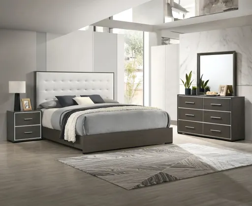 This Saxton 3pc King Bedroom Set is a great addition to any bedroom. It includes a king bed, dresser, and nightstand. The set is made of durable materials and is built to last. The Saxton collection offers a timeless design that will complement any decor. The dresser features multiple drawers for ample storage, and the nightstand provides convenient bedside storage. The king bed offers a sturdy and comfortable sleeping surface.