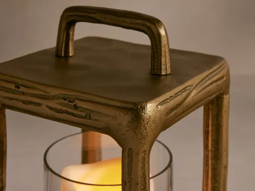 Crafted from cast aluminum with a brass finish encased by clear glass. Designed to be used with flameless candles and cannot be used with live flame candles. We recommend our Outdoor LED Candles, sold separately. 9.75" lantern accommodates our 3" x 6" Outdoor LED Candle (6510226D10KT). 15" lantern accommodates our 5" x 9" Outdoor LED Candle (6510226D12KT). 22.5" lantern accommodates our 6" x 12" Outdoor LED Candle (6510226D13KT). 27.5" lantern accommodates our 6" x 12" Outdoor LED Candle (6510226D13KT). Artisan-crafted pieces with hand-applied finishes may vary in color, pattern, shape, and texture, making each truly unique without affecting quality or performance.