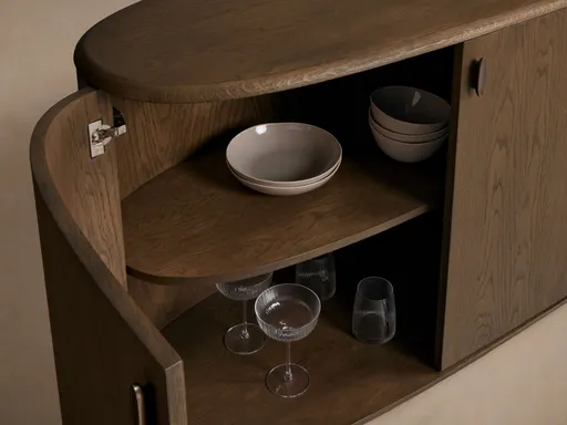 Sideboards finished in Abanos feature antique bronze hardware and are craftsman-built from oak veneer and solid oak wood sustainably harvested by our Romanian artisans’ family. Russet and Walnut-finished sideboards are crafted from American walnut wood and beech veneer and feature antique brass hardware. Features two fixed interior shelves. Finish may change over time. Natural wood may display small splits, knots, joint lines, or other organic features, adding unique character to each piece.