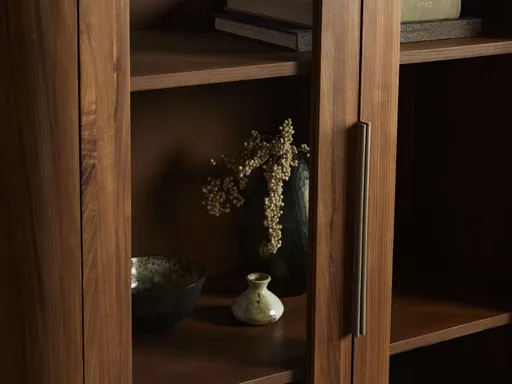 Crafted from American walnut wood veneers and features a layer of protective lacquer for a subtle sheen. Pieces finished in Sand feature brushed nickel hardware and plinths bases. Pieces finished in Walnut feature antique bronze hardware and plinth bases. Features two glass doors with four shelves (3 adjustable/removable).