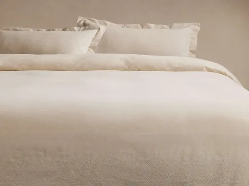 Delicately embroidered in a tone-on-tone geometric pattern, our Cadre Bedding Collection brings soft texture and refined craftsmanship to the bedroom. Offered in natural or white, Cadre layers beautifully to create a serene, timeless retreat. Crafted in India; woven from a blend of 55% linen and 45% cotton with a 100% cotton interior lining. Features hidden button closure and twill ties in each corner to secure the duvet insert. We recommend pairing with our Down Duvet Insert, available in both King (BEDINSERTK) and Queen (61BEDINSRTQ2) sizes. Designed to layer beautifully with coordinating pieces, The Bedding Collection by Arhaus has been curated to instill your everyday moments with comfort and to evoke your most restorative rest.