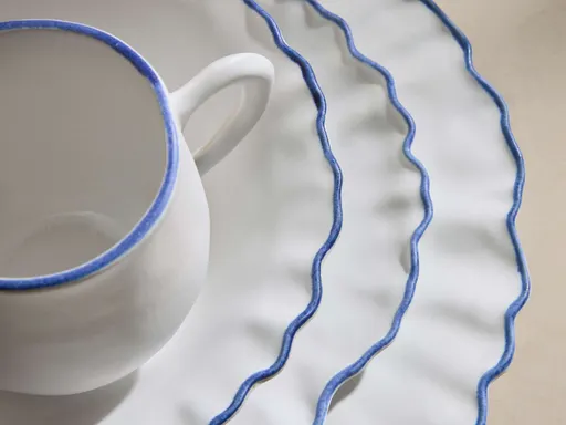 Hand-thrown ceramic stoneware from Portugal, finished with a matte glaze and hand-painted blue edging. Set of 16 includes: 4 Dinner Plates, 4 Salad Plates, 4 Pasta Bowls, and 4 Mugs. Artisan-crafted pieces with hand-applied finishes may vary in color, pattern, shape, and texture, making each truly unique without affecting quality or performance.
