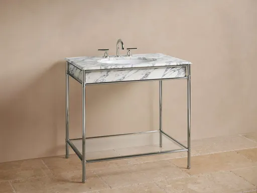 Gracefully refined, our Chelsea Bath Collection is defined by its open, airy silhouettes and delicate detailing. The stainless-steel base—offered in your choice of Antique Brass, Antique Bronze, or Polished Nickel—lends a subtle gleam while the exposed bottom creates an elegant sense of lightness. Complemented by Arabescato, Carrara, Brown Espresso, or Red Levanto marble tops, Chelsea’s thoughtful craftsmanship speaks to the well-curated home, blending antique sensibilities with a distinctly romantic charm.