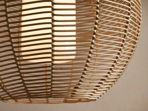Crafted from all-weather wicker, featuring a matte black powder-coated aluminum pole and a mouth-blown internal glass shade. Uses one 60-watt max E26 bulb (included). Adjustable drop length ranges from 24.5"-165.5". Matte black pole is made from aluminum. Includes 12 interchangeable matte black extension rods for hanging—four 6", four 12", and four 18". Can be mounted on a vaulted ceiling. Black and white cord is made from copper and PVC and measures 155" long. Hardwired; professional installation recommended. ETL Certified Wet.