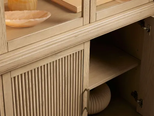 Crafted from white oak wood with a hand-applied finish and complemented by metal handles finished in antique brass. Features two glass-paneled doors with two adjustable/removable shelves and integrated, dimmable LED lighting. Base features two wooden doors with one adjustable/removable shelf. This collection is artisan-crafted from natural materials with hand-applied finishes. Individual pieces may vary in color, pattern, shape, and texture, making each truly unique.