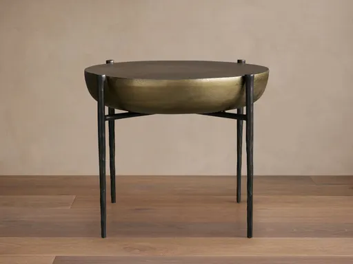 Frames are craftsman-built from cast aluminum, featuring antiqued patinas that complement the table surfaces. Table surfaces are crafted from cast aluminum, featuring a textured finish available in black nickel, antique copper, or antique brass. Surfaces are polished, plated, and coated with a protective, clear lacquer.