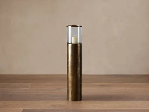The perfect accompaniment to any décor, this modern floor hurricane is crafted by Indian artisans with a mouth-blown glass cloche accented by a top metal ring. Grounded by a textured aluminum base decorated with distressed antique brass finish, this hurricane allows your favorite candle to glow with an elevated, sophisticated appeal.