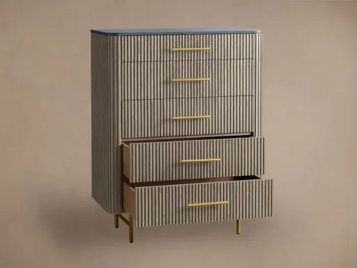 Finnley pieces with a Honey finish are constructed from white oak wood with oak veneers; Liath Smoke, Ebony, and Mocha finished pieces are constructed from Finnish pine with oak veneers. Craftsman-built pieces feature reinforced mortise-and-tenon joinery for added strength and stability and are complemented by stone to