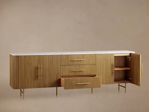 Our Finnley Collection showcases a stunning mixed-material design, inviting elevated style into any space. Hand-finished pine from Finland or white oak wood is luxuriously complemented by a stone top, accented by brass hardware and reeded oak detailing. The result is an eclectic-yet-chic collection perfect for gatherings that linger long into the night.