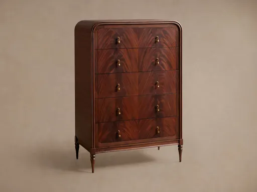 Crafted from mahogany wood and book-matched figured mahogany veneer. Figured mahogany veneer is celebrated for its inherent and dramatic flame-like grain pattern that is formed within the tree’s trunk just before two branches split apart. Features vintage-inspired brass hardware on soft-close drawers with adjustable, under-mounted glides.