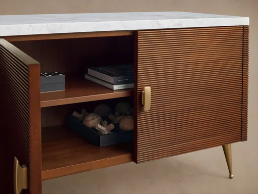 Craftsman-built from mahogany wood with a hand-applied finish. Behind four doors are two adjustable and removable shelves, providing storage for dinnerware, media, and more. Cabinet doors are detailed with horizontal reeding and complemented by oversized metal handles finished in brass. Tops feature a choice of Nero Marquina or white Carrara marble and are coated with a clear lacquer to accentuate the stone’s natural features. Marble pieces may display natural mineral deposits, swirling, joint lines, veining, or other features that will add one-of-a-kind character to your piece without affecting its quality or performance. This collection is artisan-crafted from natural materials with hand-applied finishes. Individual pieces may vary in color, pattern, shape, and texture, making each truly unique.