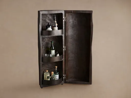 Handcrafted from reclaimed alder wood, each one-of-a-kind Log Bar is a true work of art that adds warmth to any home’s aesthetic. The beautiful graining and organic texture of wood are highlighted with an extensive hand-applied finishing process, infusing each bar with rustic charm. Thoughtful details like the raised edge on the shelving and magnetic closure add both style and function.