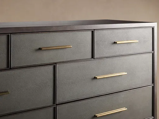 Featuring a sleek aesthetic, our Malone collection is artisan-crafted from solid parawood or oak wood—depending on your preferred finish—and surfaced with walnut or elm wood veneers. Insets made from reconstituted leather embossed with a shagreen pattern are complemented by hand-applied finishes to give this collection a modern look with intriguing textural details.