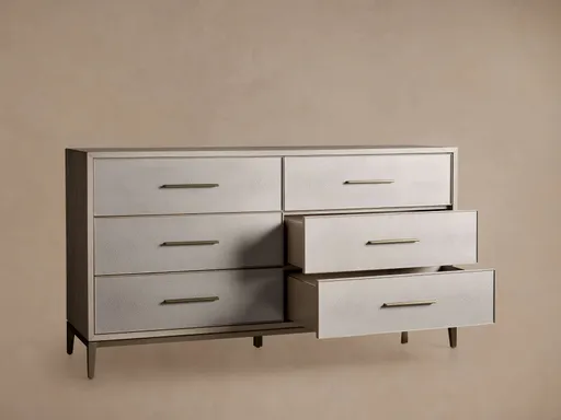 Featuring a sleek aesthetic, our Malone collection is artisan-crafted from solid parawood or oak wood—depending on your preferred finish—and surfaced with walnut or elm wood veneers. Insets made from reconstituted leather embossed with a shagreen pattern are complemented by hand-applied finishes to give this collection a modern look with intriguing textural details.