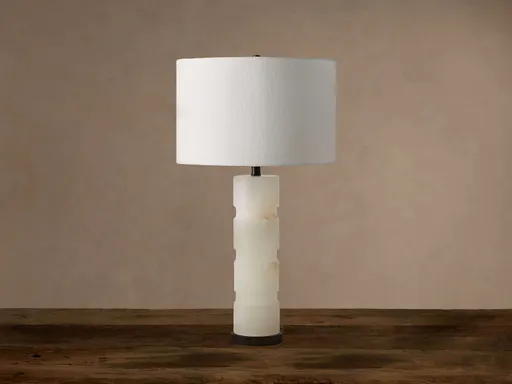 Carved from solid alabaster blocks, this stately stone table lamp elevates décor with stunningly crafted style. Complemented by a bronze-plated steel base and linen shade, this fashionable fixture is the perfect finishing touch for any space in your home.