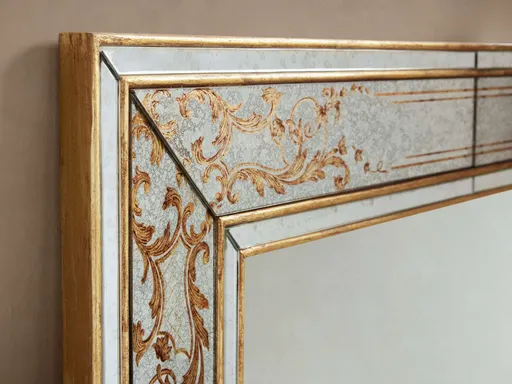 Frame is made from engineered hardwood with sturdy tenon joinery. Mirrored glass features printed and gilded motifs. Can be hung vertically or horizontally from a back-mounted cleat. Hanging hardware included. Frame measures 2" wide. Professional installation recommended.