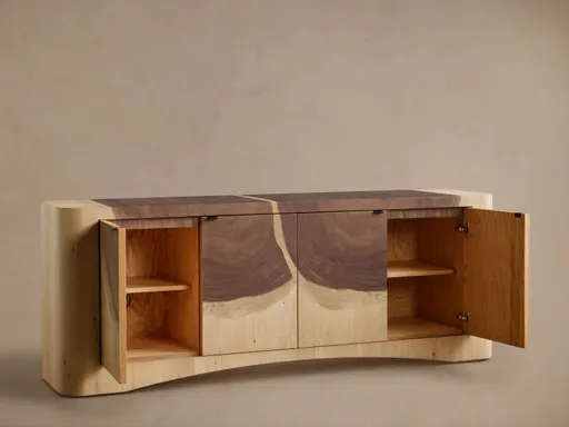 Handcrafted by artisan partners in Mexico from American oak wood and Guanacaste wood inlays. Hand-applied finishes are coated with clear polyurethane for added protection. Doors feature Bronze-finished finger pulls and open to enclosed storage, each housing a single interior adjustable/removable shelf. Natural wood may display small splits, knots, joint lines or other organic features, adding character to each piece without affecting its performance. This collection is artisan-crafted from natural materials with hand-applied finishes. Individual pieces may vary in color, pattern, shape, and texture, making each truly unique.