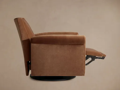 A true celebration of craftsmanship, our Rudy Collection is inspired by vintage French designs. Crafted by our North Carolina upholstery artisans working with some of the finest materials sourced around the world. Frames are craftsman-built using cross-directional hardwood laminate. Frame support system features flexible elastic webbing. Seat cushions contain dense foam made from partially plant-based material, padded with a blend of sterilized down and feathers. Backrests are filled with a supportive blend of poly fibers and back frame system is sustained by flexible elastic webbing. Solid steel swivel mechanisms are bolted to frames for lasting strength and reliability, allowing 360-degree rotation. The Rudy Collection is available in multiple pieces and customizable fabrics, leathers, and finishes. Call, email, or live chat with our Design Team to create your own. We want you to love your Rudy as much as we do. We recommend ordering a material swatch prior to purchase, ensuring the perfect color choice. Lounge Chair (non-swivel) and Ottoman are also available by special order.
