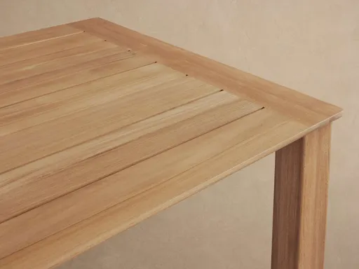 This collection is crafted from sustainably harvested Grade-A teak wood, selected for its natural beauty and durability. Zoe’s premium natural teak hardwood curated by Arhaus is untreated and unfinished; its organic color tones are honed by finely sanding into a smoothed surface. Natural teak highlights organic variations in color and graining. These characteristics may differ between pieces. Natural teak may display small splits, knots, joint lines, or other features, adding character to your piece without affecting its quality or performance. Teak hardwood contains natural oils that repel insects, prevent drying, and resist moisture. Teak is also resistant to fungal decay, rotting, and warping due to temperature or humidity. When exposed to rain showers, teak’s natural oils can be released and leave marks on new teak furniture. We recommend rinsing your teak furniture with a garden hose prior to first use. Over time, natural teak’s warm, golden color eventually fades to a silvery-grey patina. Weathering will begin immediately when left uncovered and in daylight. Dining Tables feature a hole to accommodate outdoor umbrellas. Protect your outdoor furnishings with resilient Agora® covers—specifically tailored to fit Arhaus outdoor collections (sold separately). Call, email, or live chat with our design team to learn more.