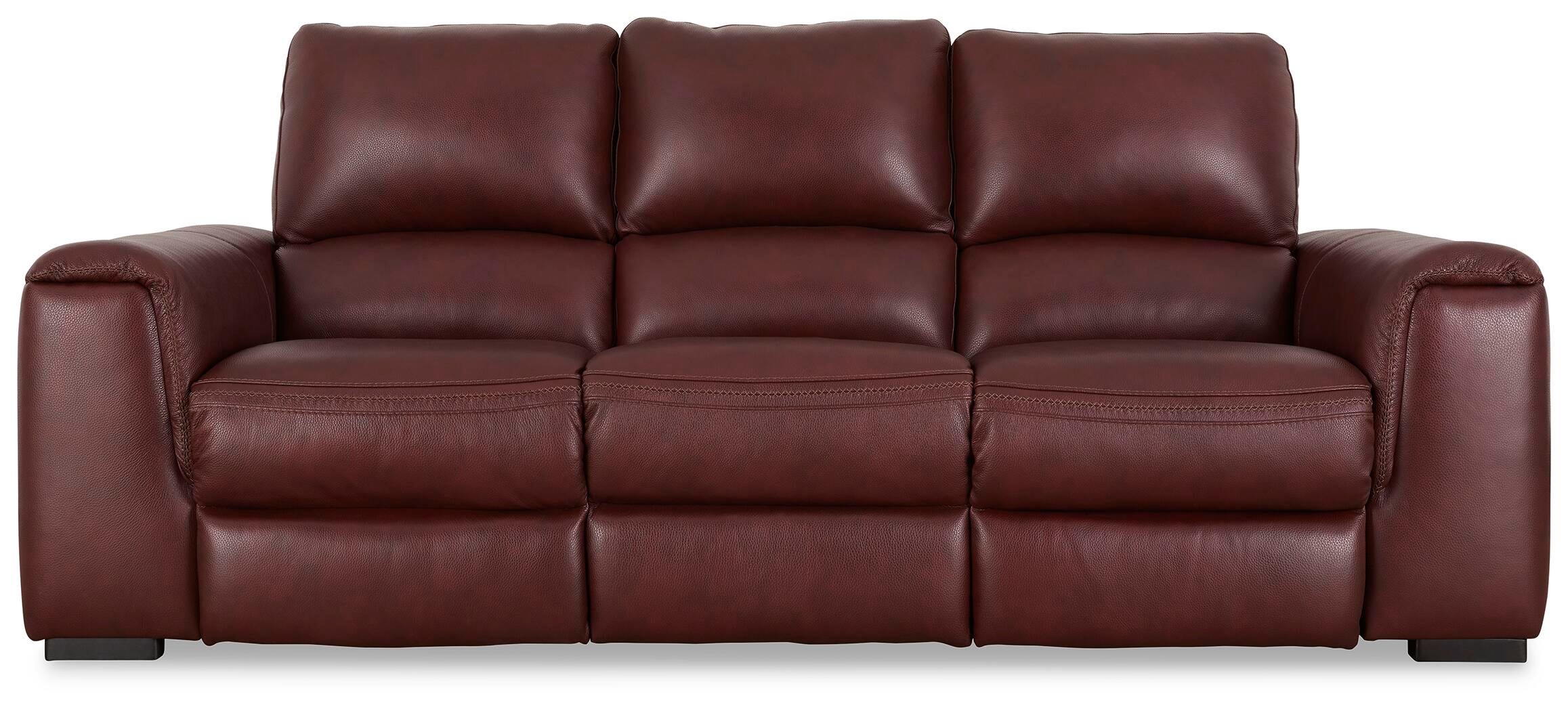 Impressive in scale while keeping an air of refinement, the Alessandro power reclining sofa stuns with a combination of soft, supple leather and perfectly matched faux leather upholstery in garnet. Sink into the seating area and cater to your comfort with one-touch power reclining and an adjustable headrest. Complete with USB charging, this sofa makes a surefire statement in your contemporary living room.