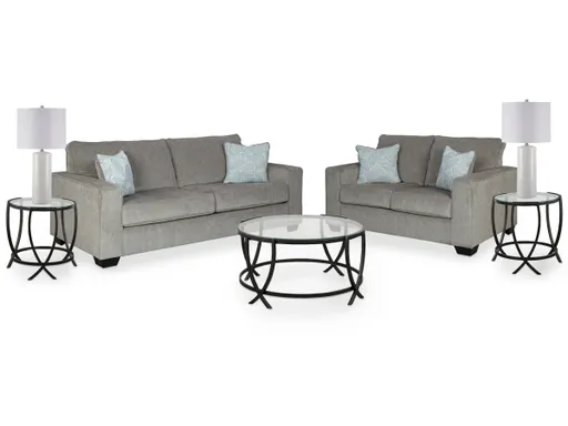 If style is the question, then this room package is the answer. The sofa and loveseat feature clean lines and sleek track arms enhanced with plump cushioning and a chenille-feel upholstery. A clear winner for lovers of contemporary style, the coffee table and end tables make a brilliant impression with a metal arc X-motif. Two ceramic table lamps have bases teeming with texture, proving that a monochromatic design can be visually interesting.