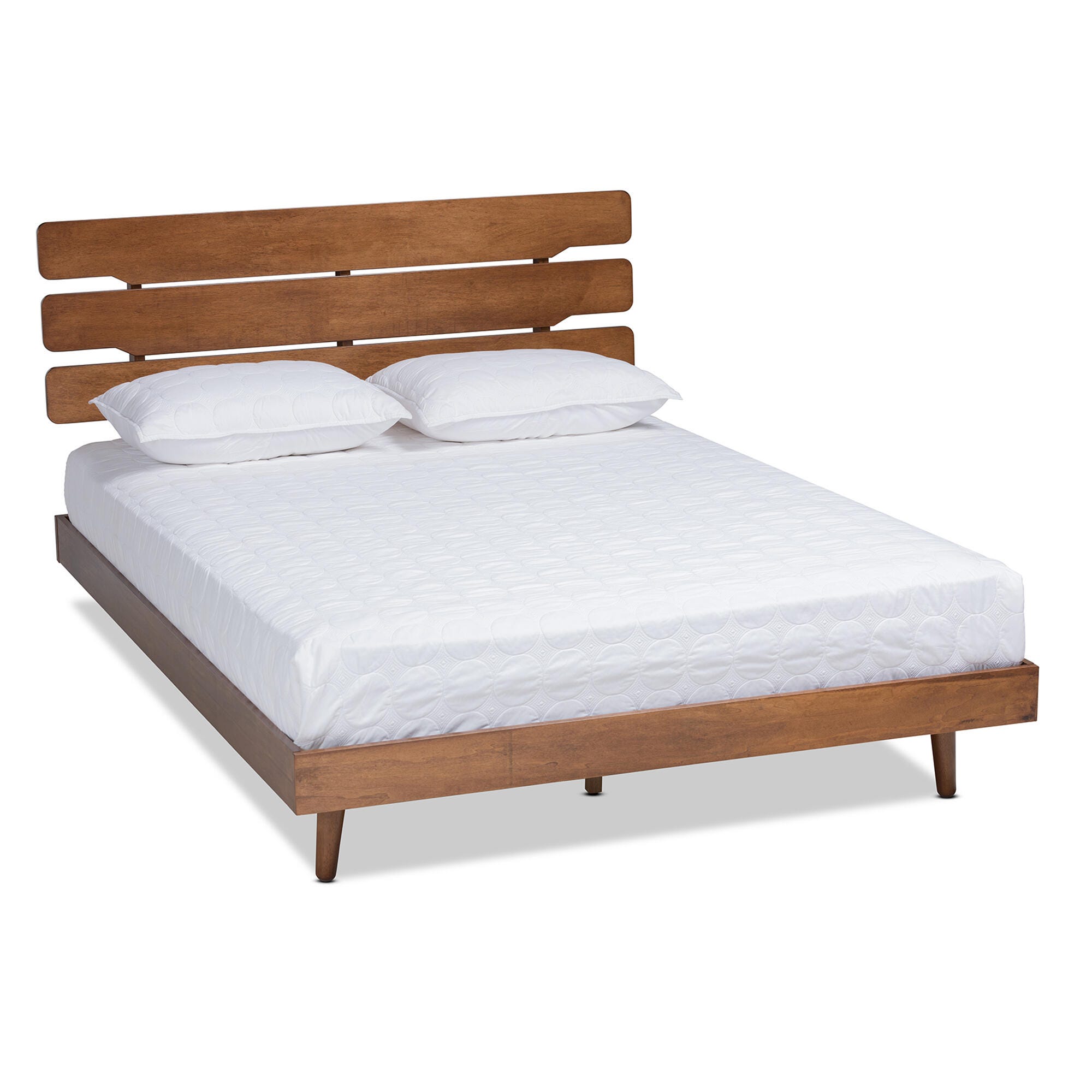 Cool mid-century design meets modern comfort in this platform bed. The solid rubberwood frame displays a warm walnut brown finish that highlights the beautiful wood grain patterns. The headboard features a unique open slat design adding texture and visual interest to your space. Its low platform profile with canted, tapered legs evokes a cozy, retro vibe.