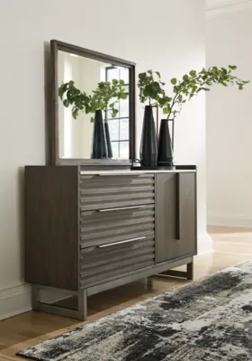 Clean lines lend sophistication and structure to the Arkenton dresser with mirror. Its complex rich grayish brown finish contrasts perfectly with a white marble top, while the streamlined silhouette features overlay slats to create visual interest. A metal base and bar pulls in a low-sheen steel finish add to this piece's contemporary vibe.