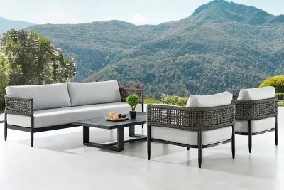 The Algeria 4 Piece Outdoor Rope and Aluminum Black Seating Set with Light Gray Cushions from Armen Living will mark all the boxes for a perfect outdoor seating set. Featuring 2 club chairs, an outdoor sofa, and a coffee table, this set is ideal for seating up to 5. The tough outdoor cushions are upholstered with stain, UV, and water-resistant, keeping you worry-free and relaxed. The Algeria features a polyester rope weave instead of wicker that is seen on most conventional outdoor furniture. The Algeria coffee table is perfect for morning or evening conversations while you watch the sunrise or sunset! Constructed of the highest quality materials, the Algeria 4 Piece Outdoor Rope and Aluminum Black Seating Set with Light Gray Cushions will provide enjoyment and comfort for many years to come.