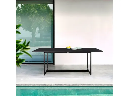 Invite fun and activity into your outdoor space with the Cayman outdoor dining table from Armen Living. Featuring a modern and streamlined design, the patio table delivers a comfortable spot for you to enjoy breakfast, afternoon meals, and candlelight dinners. This beautiful piece of outdoor patio furniture is crafted to perfection. The dining height table includes a slatted style surface to offer beauty and convenience as the elements can easily pass through. The Cayman patio table is a staple piece of outdoor furniture. Its chic aluminum table and frame feature a multi-layer powder coating for effective protection from rust, UV, weather, everyday wear, and tear. Aluminum is a light rust-proof material and can be moved from your backyard to your screened-in porch, to your garden with ease! The black finish easily incorporates into your existing design theme and the unique trestle style base gives your guests ample legroom. This rectangular outdoor patio dining table can comfortably accommodate up to 8 seats.