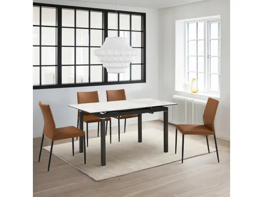 Dine, entertain, or enjoy the company of friends and family with the Giana Kash 5 Piece Extendable Dining Set with Faux Leather Chairs. This set includes 1 Giana extendable dining table and 4 Kash dining chairs. With a slim and streamlined profile, this parsons-style chair brings effortless style and elegance to your home. It is perched upon slender black metal legs to make any room appear open and spacious. It features a tall back with a subtle curve to provide exceptional lumbar support. With a simple and elegant design, our dining room chair focuses on bringing comfort and convenience to your dining table. It can easily transition anywhere from your living space to your home office to provide a comfy seat for everyday functions. This kitchen chair is upholstered in UV and stain-resistant faux leather which does not crack or fade easily to provide easy care and maintenance. The Giana dining table features an extendable, rectangular tabletop, perched upon a crisp black metal base. The tabletop is crafted in Carmen Gray Sintered Stone to offer a luxe appeal with easy maintenance. This tabletop is resistant to etching, scratches, burns, and stains as a sturdy yet elegant alternative to quartz. With a durable construction and versatile appeal, our dining table is perfect for both casual and formal meals in a kitchen, dining room, or living space. The dining table can easily extend to seat up to four to six individuals. The Giana Kash dining set is available in 5 and 7 piece set configurations and features a camren gray Sintered Stone table top with black base and your choice of taupe gray, brown, or black faux leather upholstery.
