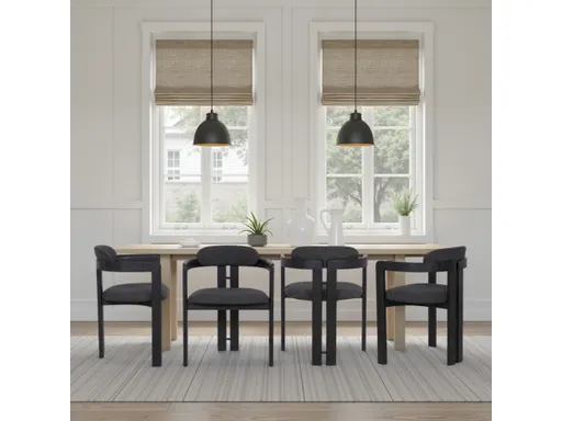 The Armen Living Jazmin contemporary dining chair features a unique frame design that is guaranteed to enhance the beauty of your modern household. The Jazmin's impressive wooden frame features a 3 leg base design and tall arms which serve as stylish contemporary accents. The chair's modern Charcoal Fabric upholstery is stuffed with concentrated foam which provides excellent seat and back padding. Though a wonderful choice for the dining or living room, the Jazmin's versatile design allows it to function well as additional seating in just about any room of the house. The stylish Jazmine chair is available in your choice of either a black brush or walnut wood finished frame. This product includes 4 dining chairs.