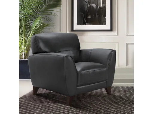 The Armen Living Jedd contemporary genuine leather chair is a sophisticated choice for any modern household. The plush back and seat of the Jedd is padded with Dacron, assuring that the genuine cowhide leather upholstery remains crack and wrinkle free while also providing an exceptional degree of comfort. The Jedd's legs are made of durable hardwood and their beautiful brown wood finish complements the leather fabric without detracting from the quality of the Jedd's construction. Sleek, stylish, and immaculately designed to deliver a perfect coupling of durability and relaxation, the Jedd is a wonderful choice for any contemporary home. For a cohesive living room aesthetic, consider pairing the Jedd chair with the accompanying loveseat and sofa. The Jedd is available in dove gray leather accented by beautiful white stitching. Included: Chair Color: Dove gray Material: Wood, Genuine leather Feature: Fully assembled Feature: Cushion density with high-resiliency, 2.2-density foam cushioning Feature: Hand-stitched details Feature Seat Comfort: Semi-Firm Feature: High quality steel reclining mechanisms Features: Beautifully crafted to perfection with comfort and paratactically in mind Features: Both sophisticated and simple for any space in your home Features: The versatile style and color will compliment any modern, contemporary or traditional style home Features: 100% genuine leather Features: Offers silky smooth leather that let you sit comfortably anywhere in your home Features: Wood base foundation for sturdiness and durability Ships In: 1 Boxes Dimensions: 39.3 W X 36.2 D X 34.63 H Seat Dimensions: 23.6 W X 20.8 D X 19.6 H Arm height: 22.1 H Leg height: 5.1 H Comes with standard 1 year limited warranty NOTE: Color and saturation may vary due to lighting and monitor/phone screen settings