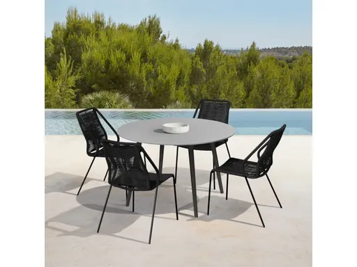 Dine alfresco with friends and family by gathering around the Kylie and Clip Outdoor Patio 5 Piece Dining Set in Rope with Black Eucalyptus Wood from Armen Living. Constructed from eucalyptus wood and a gray Superstone top, this table is a modern addition that easily fits into any dining space indoor or outdoor. The round patio dining table features sleek tapered wood legs that allow for ample leg room. One of the best reasons to choose eucalyptus wood for your outdoor furniture or four-seasons porch is that it is exceptionally resistant to decay and rot. It naturally resists the influence of moisture because of the high oil content it naturally contains. That means it can get damp without you worrying about whether damage will occur. It can withstand several different outdoor elements while lasting for many years if it receives proper care. The intricately woven rope featured on the durable metal frame of the Clip chairs form to offer you extreme comfort and relaxation. These outdoor dining chairs are wrapped in resilient regatta rope cording, providing supple support while still allowing for element passthrough, and also enhance your seating experience with a softness that rivals most fabrics. Each chair is made with the best craftsmanship, with these chairs standing on top of durable metal legs in a black finish for a modern look. Defined by functional simplicity and timeless beauty, the dining table delivers a harmony of natural textures to complement any outdoor space. Our outdoor dining table measures 47 inches in diameter and remains perfect for entertaining in your patio, backyard, or balcony. The stone top features a 5-layer composite with 2 layers of cement fiberboard surrounding the aluminum honeycomb core. This beautiful tabletop is durable and robust - capable of withstanding inclement weather and everyday wear and tear. The Kylie and Clip patio dining set features a black eucalyptus dining table with gray stone top, and your choice of gray, black, blue, or brick red rope Clip dining chairs.