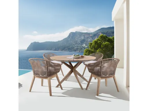 Introducing the perfect outdoor dining ensemble to elevate your patio experience: the Tutti Frutti Outdoor Patio Dining Chair and the Oasis Outdoor Patio Round Dining Table by Armen Living. Crafted with meticulous attention to detail, these pieces seamlessly blend classic elegance with modern design, enhancing both comfort and style. The Oasis contemporary outdoor dining table is a masterpiece ideal for the contemporary household patio. Stylish and durable, this dining table features a gray Superstone center and eucalyptus wood in a light, natural finish. This combination of materials creates a look of practical sturdiness without compromising on the contemporary aesthetic of the piece. The Tutti Frutti Light Eucalyptus and Truffle Rope Indoor Outdoor Dining Chair from Armen Living is the quintessential choice of an outdoor dining chair that will give your living area a whole new aesthetic and presentation for you to enjoy. Featuring a eucalyptus wood base, the Tutti Frutti is durable and highly weather-resistant giving you years of extra enjoyment thanks to the longevity of these chairs. The incredibly comfortable seat cushion is meant to keep relaxed and alleviate any discomfort. This chair is designed with a unique feature where the frame is wrapped with highly durable and an immensely intricate woven rope - adding a completely new dimension to your outdoor furniture which will last just as long and will be even more eye-catching than conventional outdoor frame material. Pair it with wood surfaces for an eclectic boho feel or with concrete surfaces for a modern retreat. Its sturdy eucalyptus base is paired with an intricate marine-grade Regatta cord seat and topped with a soft cushion for a lesson in style and comfort. The rounded back gives ample support for lounging on beautiful patios and lush gardens. Whether enjoying a quiet evening or hosting a lively get-together, this ensemble promises enduring elegance and functionality.