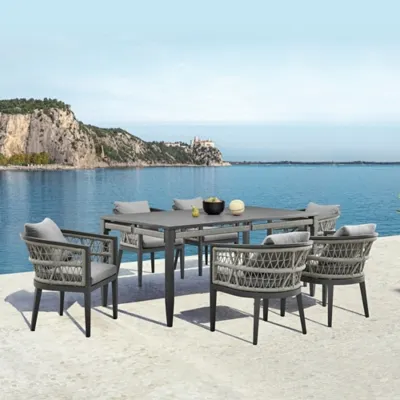 Introducing the Zella Outdoor Patio 7 Piece Dining Set in Aluminum with Light Gray Rope and Cushions - a perfect fusion of modern design and outdoor comfort meticulously crafted to elevate your outdoor dining experience. The set combines the sleek allure of aluminum with the inviting texture of light gray rope detailing and plush cushions in an Earl Gray color made from solution-dyed acrylic fabric, creating a sophisticated and enduring ensemble. The Zella Outdoor Patio Dining Chair, a harmonious masterpiece, features a robust aluminum frame for durability and contemporary aesthetics. Water-resistant and UV-resistant, these chairs stand as reliable and stylish seating solutions for your patio or outdoor dining area. The incorporation of light gray rope detailing adds a unique visual dimension, creating a captivating contrast with the smooth aluminum frame. Paired with Earl Gray cushions, these dining chairs invite you to dine in both style and comfort, whether hosting a lively dinner party or enjoying a quiet family meal. Completing the set is the Zella Rectangular Dining Table, a sophisticated centerpiece meticulously crafted to redefine your outdoor dining experience. With a sturdy aluminum frame and a refined charcoal finish, this table effortlessly complements various outdoor settings. The inclusion of light gray rope detailing adds a unique visual dimension, creating a captivating contrast with the smooth aluminum frame. Designed for outdoor durability, the Zella Dining Table features water-resistant and UV-resistant attributes, remaining a steadfast and stylish addition to your patio. Whether hosting a large outdoor dinner party or enjoying a cozy family meal, this table offers a spacious and inviting setting for your dining needs. Transform your outdoor dining space with the Zella Outdoor Patio Dining Set, where contemporary elegance meets the demands of modern outdoor living.