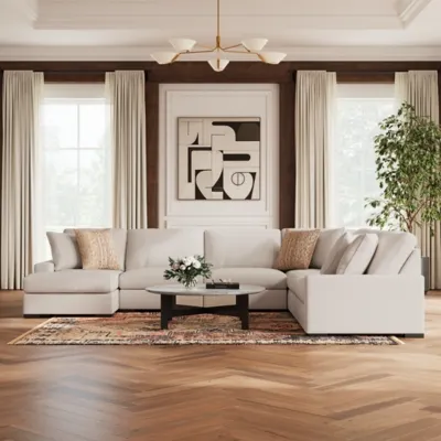 A tailored approach to enduring comfort and versatility. The Calden sectional with chaise unites a sculptural silhouette with soft oyster white boucle to create the essence of quiet sophistication. It elevates your space while creating a genuinely inviting centerpiece for your home.