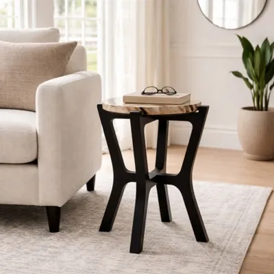 Elevate your home with this modern accent table, a stylish and functional addition to any space. Crafted from premium wood with a rich natural finish, this table features a unique live-edge design that adds character and warmth to your decor. The sturdy black metal legs provide excellent stability while enhancing its contemporary aesthetic. Measuring 14 x 14 x 20 inches, this compact side table is perfect for small spaces, making it ideal for use as a living room end table, bedside nightstand, or decorative display. Its lightweight yet durable construction allows for easy mobility, while the smooth surface is simple to clean and maintain. Whether you need a chic spot for your coffee cup, lamp, or favorite decor pieces, this versatile table seamlessly complements modern, industrial, and farmhouse interiors. Upgrade your space with this beautifully crafted accent table and bring a touch of elegance and practicality to your home.