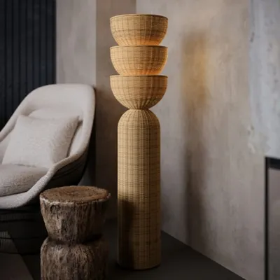 Repetitive geometric shapes drawn from mid-century motifs create an eye-catching totemic stack in this floor lamp. Each natural wicker bowl is individually lit, allowing a soft diffusion of light through the textural weave. With an impressive height of 55 inches, this 3-light floor lamp makes for a striking sculptural addition to any room.