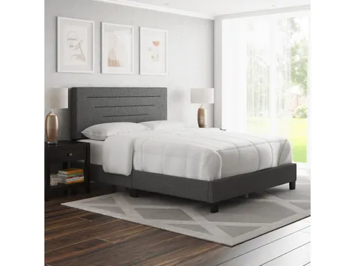 The clean lines and geometry of this upholstered bed make this a perfect addition to a modern bedroom. Fully upholstered and padded headboard feature simply stitched horizontal lines. Sideboards and footboard are also upholstered for a uniform, polished appeal. Support system consists of 6 perimeter legs, 4 cross beams plus center support legs that easily support up to 700 lbs. This bed ships in 1 box for easy transport and is backed by a 1 Year Warranty. Assembles in under 15 minutes and all hardware is conveniently zipped up on the back of the headboard.
