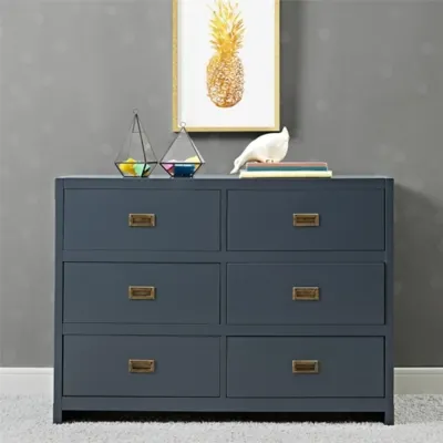 Create a space that is fun and sophisticated with the delightful Miles 6-Drawer Dresser by Baby Relax. Combining campaign and modern style, this charismatic dresser is crafted with a sturdy wood construction and includes six spacious drawers. From functionality also sprang great design with modern features such as clean lines, a fresh finish, and aged brass-tone sunken metal pull drawer handles. Available in multiple color options so that you can find the perfect fit to complement your nursery decor.