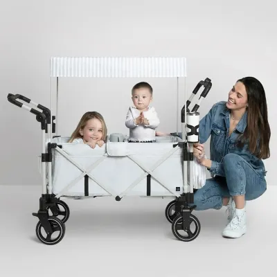 The most responsibly made wagon. Designed for the future in every possible way, all the soft fabric is made from recycled water bottles. Plastic drinking bottles are sorted, cleaned and shredded into flakes that become the yarn the seat fabric is made from. A great choice for your child and the planet, this versatile wagon features two cushioned seats with three-point safety harnesses for security while the removable center console with two cup holders and storage pocket allows kids to share snacks, toys and drinks. Two additional cup holders for parents and side pockets ensure you can bring everything you need along for the adventure. The removable, UV blocking canopy and roll-down shades offer privacy and protection from the sun or rain. Easy to drive, it features swivel front wheels that allow you to effortlessly turn and pivot, as well as push and pull leatherette handles with adjustable heights. The wagon's compact fold makes it easy to store or transport. And when your children outgrow the need for a wagon, use it to haul your own gear at the farmers market, while gardening or the grocery store. Holds up to 110 lbs. (55 lbs. per seat). Weighs 38 lbs. Recommended for ages 9 months up to 55 lbs.