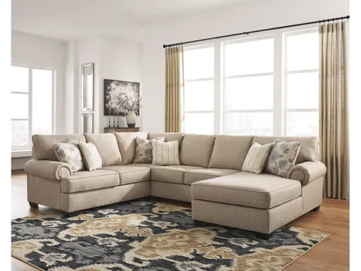 Lighten things up in a comfortably chic way with the Baceno sectional in "hemp" beige. Traditional elements such as t-cushion styling and prominent piping are modified with slanted roll arms for a beautiful balance of classic and contemporary. Linen-weave textural fabric is paired with posh designer pillows that truly perfect the look.
