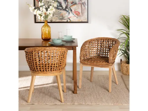 Encourage a sense of exotic serenity in your space with the charming design of the Mario dining chair. Made in Indonesia, this bohemian inspired piece consists of a solid teak wood base topped with a natural rattan seat. Its curved backrest is interwoven with rattan rods for an eye-catching yet cozy display while sloping armrests offer enhanced relaxation. The Mario will arrive fully assembled and features angled legs for excellent stability and support in timeless design. Simple yet refined, the Mario dining chair is a refreshing addition to any layout. Due to the nature of the natural materials used in this product, it may have variations in areas such as, but not limited to, color, pattern, grain and texture. The hair-like strands of rattan/rattan-fiber are common due to nature of the material.