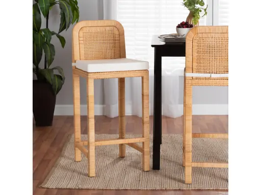 Savor an air of serenity for every occasion with the soothing tones of the Zariah bar stool. Handcrafted in Indonesia, this bohemian piece consists of a solid wood frame wrapped in natural rattan. The seat is fitted with a plush cushion padded with foam and upholstered in lavish fabric for a remarkably cozy embrace. The Zariah will arrive fully assembled and features an ergonomic footrest for enhanced relaxation. Exuding the charm of an exotic retreat, the Zariah dining chair is sure to invigorate any home bar or lounge area. Due to the nature of the natural materials used in this product, it may have variations in areas such as, but not limited to, color, pattern, grain and texture. The hair-like strands of rattan/rattan-fiber are common due to nature of the material.