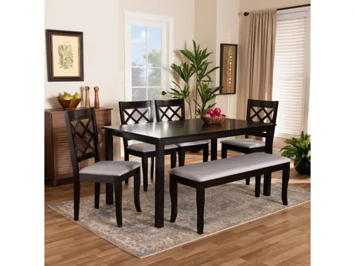 Casual elegance defines the Andor dining set. This wooden set includes one table, one bench and four chairs, each upholstered in a light fabric that complements the dark brown wood finish. Foam padded seats provide endless comfort during long dinners with friends and family. Exquisite cut-outs on the chair backs provide a light, airy feel, while cabriole legs lend a classic look. The Andor dining set is well suited for both casual and formal dining.