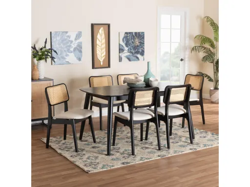 Enrich every meal with the traditional composure of the Dannon dining set. Made in Malaysia, this mid-century inspired set includes six chairs and one table crafted from sturdy wood. Each seat is padded with plush foam and upholstered in soft fabric while the backrests feature beautifully woven rattan for an invitingly cozy display. The Dannon requires assembly and features a broad, rectangular tabletop with rounded corners to offer ample space for each member of the table. Striking a poise of timeless charm, the Dannon dining set forms an exuberant arrangement for any occasion.